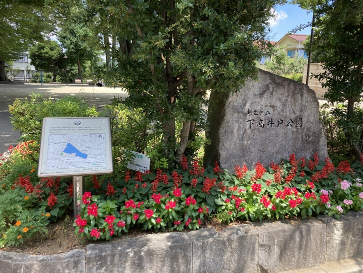 神田川から堂下橋を渡ってすぐの交差点角に三井の森公園の入口があります。レンガを埋め込んだお洒落な遊歩道の脇には、樹齢70年を越える桜並木が続き、初春に咲く樹高10メートルのコブシ、初夏に花をつけるホソバタイサンボクの大樹など、野趣あふれる公園です。三井の森公園は、かつてこの地にあった三井上高井戸運動場の跡地に平成二十二年(2010年)に開園した杉並区内でも最も広い樹林地のひとつです。昭和の初期から「三