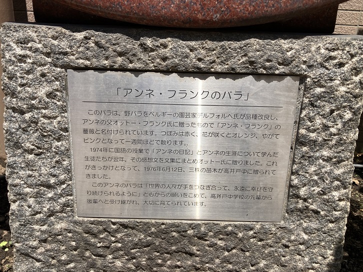 - アンネの父のオットー・フランク氏から高井戸中学校へ贈られたバラが、平和のシンボルとして大切に育てられています。