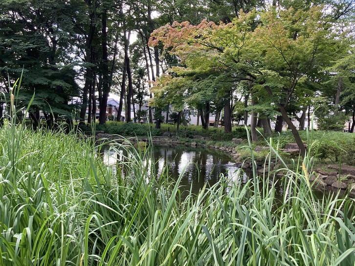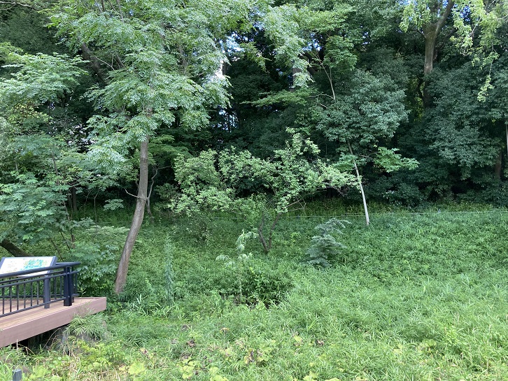 正面に見える林は、神田川が削ってできた崖線のみどりです。柏の宮公園や塚山公園の林など、神田川沿いには多くの崖線のみどりのつながりが見られます。これらの林には、雑木林を構成する、イヌシディ、クヌギやアカマツ、暗い林の中でも生長するシラカシなどの木が生えています。かつて釣堀の一部として利用された正面の池は、動物のすみかや休憩所となり、ヒメガマなどの水辺に生える植物もあります。雑木林のみどりと水辺は、生き物たちが豊かに生きる環境を生み出しています。