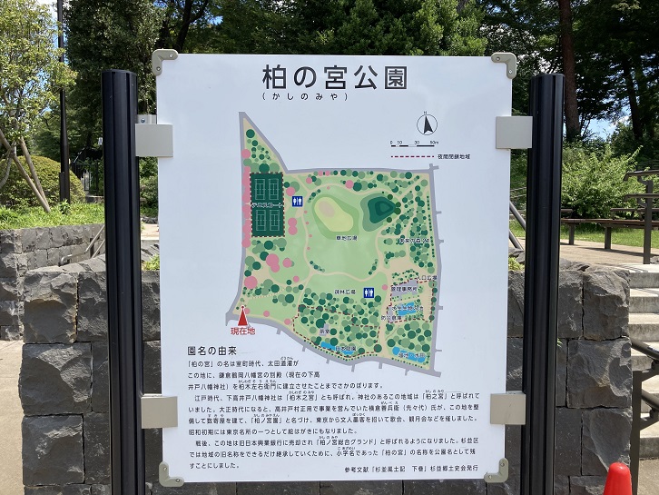「柏の宮公園」は、かって日本興業銀行が所有していたグラウンドが同行のリストラ(みずほ銀行との統合)の際に杉並区に売却され、それを杉並区が公園として整備したものです。平成十六年(2004年)に開園し、敷地面積は4.3ヘクタールと、杉並区立の公園としては最大規模を誇ります。草地広場や池、テニスコート、日本庭園や茶室などに加え、区の防災施設として災害備蓄倉庫や防災井戸も設けられています。案内板には「柏の宮公園」の園名の由来が記されています。