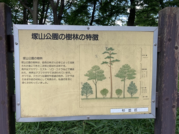 塚山公園の樹林は、自然の林が人の手によって伐採された後にできた二次林と呼ばれる林です。高木はアカマツ・ミズキ・ソロ・コナラなどで構成され、林床はアズマネザサでおおわれています。かつては、アカマツは建材や鉄道の枕木、コナラはたきぎや炭の材料として利用され、私達の生活と深くかかわっていました。