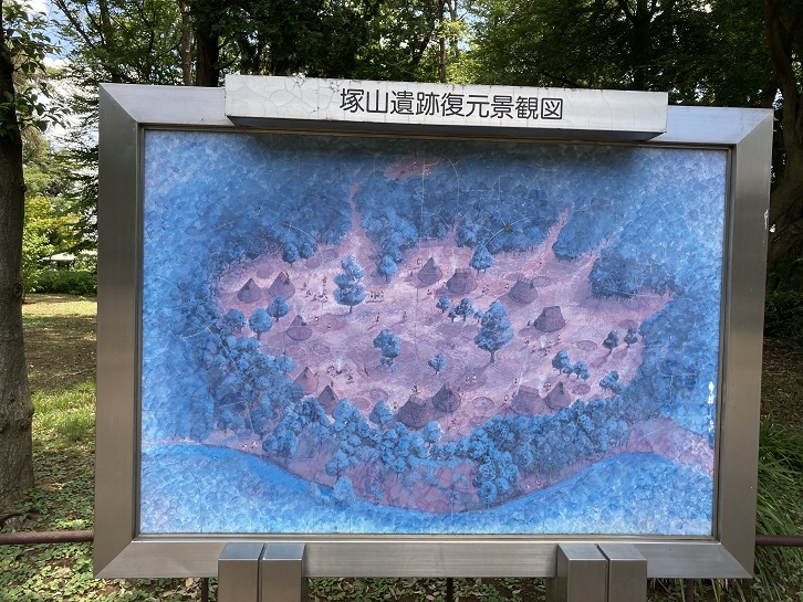 本遺跡は塚山公園の北側に突出する台地部分に広がる、縄文時代中期前半から中頃(約4500年〜3500年前)にかけての集落遺跡で、数度の学術調査により出土した多くの土器や石器とともに、全国的にも数少ない環状集落跡として知られています。遺跡は中央部分に広場を形成し、縁辺部周辺に住居を構築する景観的特徴を持つもので、現在の公園の下には広場や200軒を越す堅穴住居跡がそのまま大切に保存されています。その全体像は都内でも屈指の大規模集落と推定されています。