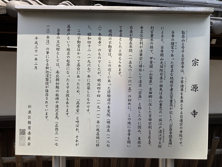 叡昌山と号する宗源寺は、十界諸尊を本尊とする日蓮宗の寺院です。当寺の檀家であった有名な地理学者志賀重メが記した「宗源寺開基碑」によると、当寺開山光伯院日善の祖先は畠山重忠の一族江戸遠江守太郎判官重永の孫で、甲斐国(山梨県)吉田郷に住した吉田宗利とされます。寺名は宗利が法華宗に帰依して法名「宗源」と称したのに因み、末孫の日善が慶長年間(1596年〜1615年)の初めに、この地に当寺を開いて寺名としたと伝えられます。境内の不動堂は、この近くにあった修験道の本覚院(明治五年【1872年】廃寺)のものでしたが、明治四十四年(1911年)に現在地に移し、昭和四十二年(1967年)に改築したものです。この不動堂はかつて高台にあったため、「高井堂」と呼ばれ、それが高井戸という地名の起源になったとする説もあります。当寺の文化財としては、南北朝初期の板碑や滝沢求馬(正徳三年【1713年】没)の筆になる釈迦涅槃図が保存されています。