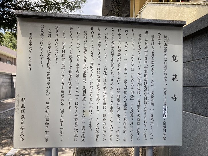 清月山覚蔵寺は日蓮宗の寺で、本尊は十界曼荼羅・宗祖日蓮聖人像です。当寺はもと真言宗の寺でしたが、慶長年間(1596年〜1614年)に日蓮宗に改宗、中興開山は実成院日相と伝えられています。当寺に安置されている鬼子母神像は、日蓮聖人の直刻と伝えられています。このことは「江戸名所図会」にも記載されているもので、文永八年(1271年)聖人が龍ノ口法難にあわれる前、馬に乗せられ鎌倉の町を引きまわされて刑場に向う途中、一老女からごまのぼた餅を供養され、そのお礼として手渡したものであるといわれています。この像は江戸時代の中頃に、鎌倉の妙法寺から当寺に安置され、それ以降開運鬼子母神として、人々の信仰を集めるようになり、寺運も大いに栄えたといわれています。境内の日蓮聖人五百遠忌塔は、天明元年(1781年)頃に建立されたもので、昭和五十六年(1981年)は聖人七百遠忌の年にあたり、それを記念して銅像を建立しています。また、開山日相聖人塔は三百五十遠忌の年(昭和四十一年)に建立されたものです。なお、当寺は大本山池上本門寺の末で、現本堂は昭和三十一年に改築されたものです。