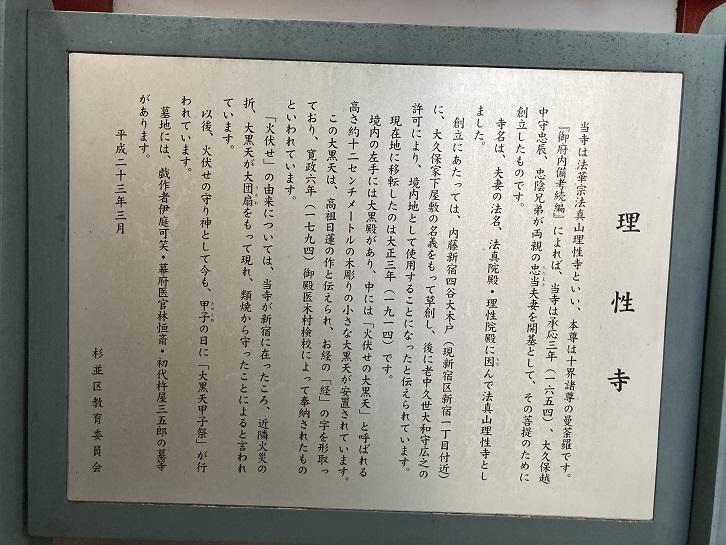 当寺は法華宗法真山理性寺といい、本尊は十界諸尊の曼荼羅です。「御府内備考続編」によれば、当寺は承応三年(1654年)、大久保越中守忠辰、忠陰兄弟が両親の忠当夫妻を開基として、その菩提のために創立したものです。寺名は、夫妻の法名、法真院殿・理性院殿に因んで法真山理性寺としました。創立にあたっては、内藤新宿四谷大木戸(現新宿区新宿一丁目付近)に、大久保家下屋敷の名義をもって草創し、後に老中久世大和守広之の許可により、境内地として使用することになったと伝えられています。現在地に移転したのは大正三年(1914年)です。境内の左手には大黒殿があり、中には「火伏せの大黒天」と呼ばれる高さ約十二センチメートルの木彫りの小さな大黒天が安置されています。この大黒天は、高祖日蓮の作と伝えられ、お経の「経」の字を形取っており、寛政六年(1794年)御殿医木村検校によって奉納されたものといわれています。「火伏せ」の由来については、当寺が新宿に在ったころ、近隣火災の折、大黒天が大団扇をもって現れ、類焼から守ったことによると言われています。以後、火伏せの守り神として今も、甲子の日に「大黒天甲子祭」が行われています。墓地には、戯作者伊庭可笑・幕府医官林恒斎・初代杵屋三五郎の墓等があります。