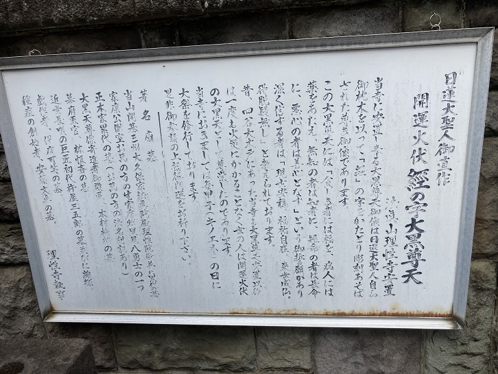 参道入口の脇には、「大黒尊天」と彫られた石碑が建っています。理性寺には、日蓮の作といわれる「火伏せの大黒天」という大黒天像が安置されています。この大黒天は、火災の時に大団扇をもって現れて、火災を防いだという逸話から「火伏せの大黒天」と呼ばれるようになりました。大黒尊天像は拝めませんでしたが。