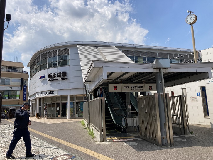 ゴール地点の西永福駅に着きました。京王井の頭線西永福駅は、かって改札口は南口の一ヶ所のみで、ホームと駅舎間は地下道で結ばれていました。その後、バリアフリー対応と踏切による交通障害を解消するため、橋上駅舎化(北口開設・エスカレータやエレベーターの設置)と駅南北自由通路の設置が決定し、平成十九年(2007年)10月から工事を開始し、同年12月16日より、橋上駅舎改札と北口(北口エスカレータ・エレベーター・階段)と改札内エスカレータ・エレベーターの供用を開始しました(やけに早い!)。北口のエスカレータはスペースの都合上、上り方向のみの設置となっています。隣の駅の永福町駅とは700mしか離れておらず、浜田山駅も含めて両駅のプラットホームが見えます。