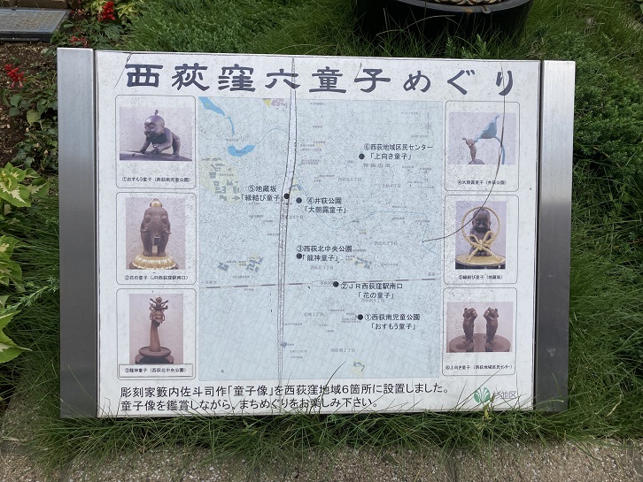 駅前の花壇の中に「西荻窪六童子めぐり」と題した案内板が置かれています。中野区の「鷺ノ宮駅〜野方駅コース」を巡った際に、都立家政商店街に「かせいチャン七福神」の像が置かれていましたね。西荻窪は七福神の代わりに童子像が置かれているそうです。全部で6体あるようですが、相互の関連はわかりません。