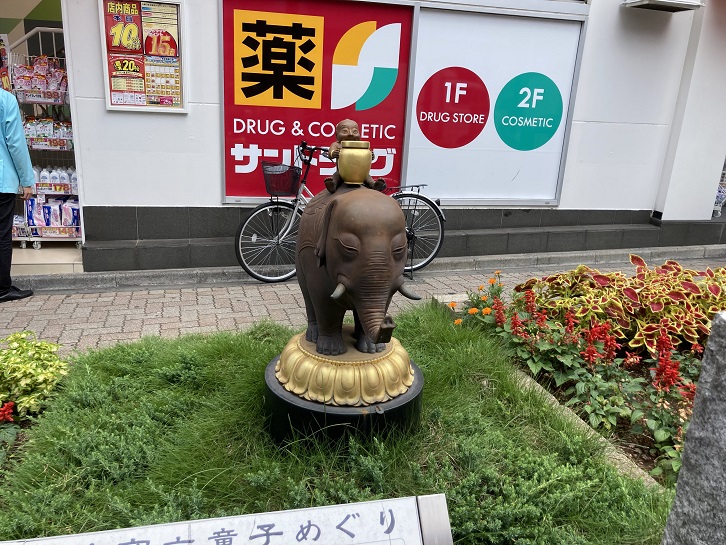 案内板の後ろに、小さな象のモニュメントが置かれています。「A花の童子」のようです。よくよく見ますと、象の背中に壺を抱えた子供が乗っています。壺の中には花が詰められていて、落ち込んだ人に花を配っていくのでしょうか?
