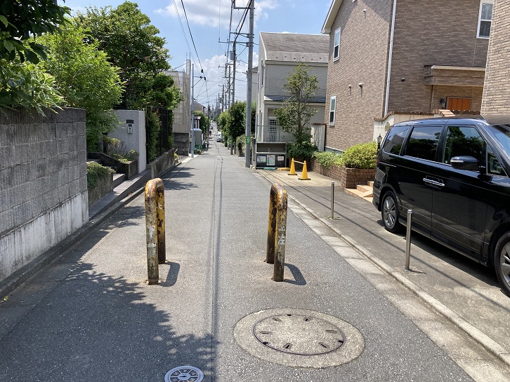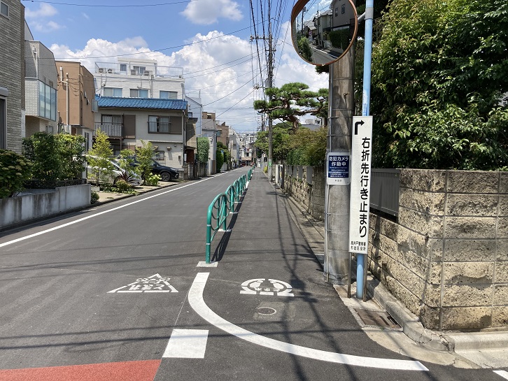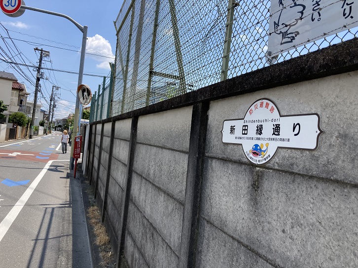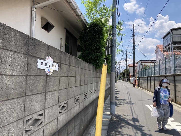 住宅街の道路に面した壁に「通り名」を記したプレートが貼られています。ナマズの絵が添えられていますので、防災時の避難路の案内も兼ねているようです。「新田縁通り」の説明書きには、「徳川家綱の代(1660年頃)に開墾された大宮前新田の南端の道」と記されています。また、「開閉塔通り」の説明書きには、「東京電力の開閉鉄塔のある道」と記されています。「開閉鉄塔」とは、送電線の入り切りの機能を持たせ、複数の回線のどちらにでも切り替えて接続できるような仕組みを持った鉄塔のことをいいます。工事で送電を停止した際や、突発事故の際に予備回線としての冗長性を持たせています。片側の回線が使えなくなってしまった時に発電所から送電できなくなるということでは困りますからね。