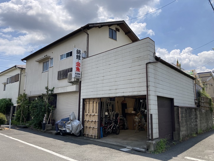 高井戸第四小学校の東の松庵川沿いに、見所ポイント3の「金魚屋養魚池」の関口養魚場があります。表からは見えませんが、物置の裏に池があって鯉が泳いでいるみたいです。その昔は釣り堀をやっていた時代もあったとのことです。