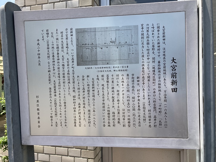 昔、富士見ヶ丘に住んでいた頃、井ノ頭通りを挟んだ一帯に宮前という地名がありました。その宮前の地名の由来となったのが見所ポイント6の「大宮前新田」です。この一帯はもともと江戸幕府御用達の茅刈場(武蔵野御札茅場千町野の一部)で、茅の刈り取りが禁止されていました。明暦三年(1657年)の明暦の大火の後、江戸市中での茅葺屋根が禁止されたために茅刈場の必要性がなくなり、またその頃に玉川上水が引かれたこともあって、新しく農地が開拓され、この農地が大宮前新田という村になりました。大宮前新田は、武蔵国豊島郡関村(現在の練馬区関)の名主で、武蔵野御札茅場千町野の野銭を徴収し代官に納める野守であった井口八郎右衛門が万治元年(1658年)頃に五日市街道沿いの開墾の成功を祈願して建てた春日神社に由来します。井口八郎右衛門ほか2名の百姓は、900両の上納金をもって武蔵野御札茅場千町野の開拓を行い、大宮前新田・無礼(牟礼)前新田・連雀前新田ならびに関前の4村および屋敷184戸の村を作りました。未開墾地に村立の設計を立て、屋敷地・農地および採草地を合理的に設営した近世の特徴的な村でした。幅2間の砂川道(現在の五日市街道)の両側に、60戸の屋敷地を間口20間ずつ割り当て、奥行250間の短冊型の長地割(のぼり)で屋敷地5畝10歩の後に、上畑・中畑・下畑および林と続いて1戸としました。また、名主および寺社は間口を2倍としました。
