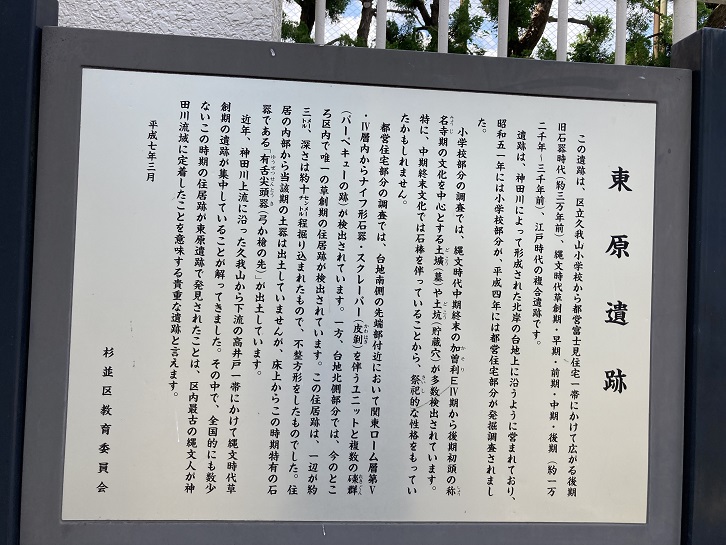 久我山小学校の脇に、見所ポイント9の「東原遺跡」の案内板があります。杉並区には古代の遺跡が数多くあったんですね。