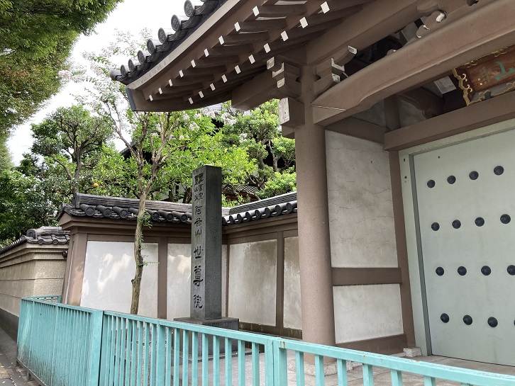 世尊院は阿谷山正覚寺ともいい、真言宗豊山派の寺で本尊は不動明王です。創立は、現在中野区にある宝仙寺が阿佐谷から移転した頃と伝えられ、武蔵名勝図会には、その時代を永享元年(1429年)頃と記されています。この移転以前の宝仙寺は、現在の阿佐谷南三丁目九番付近に山門をかまえ、当時の寺領は、中央線の阿佐谷駅付近にまで至る大寺であったといわれています。この宝仙寺が移転した後に、宝仙寺の子寺で、地元村民の寺として残されたのが世尊院です。本尊の不動明王立像、観音堂の聖観世音菩薩立像や阿弥陀如来坐像は、室町様式のうかがえるりっぱな仏様であります。なお明治二十二年から大正十一年まで、旧杉並村の村役場がこの寺の本堂におかれていました。現在の本堂は、昭和十年に再建されたものですが、都道133号線建設のため、昭和四十八年現在地に移築し、今日に至っております。