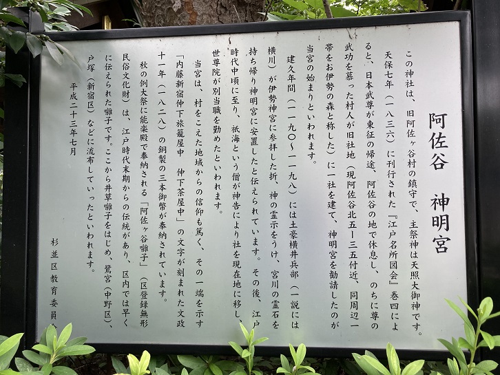 この神社は、旧阿佐ヶ谷村の鎮守で、主祭神は天照大御神です。天保七年(1836年)に刊行された「江戸名所図会」巻四によると、日本武尊が東征の帰途、阿佐谷の地で休息し、のちに尊の武功を慕った村人が旧社地(現阿佐谷北5−35付近、同周辺一帯をお伊勢の森と称した)に一社を建て、神明宮を勧請したのが当宮の始まりといわれます。建久年間(1190年〜1198年)には土豪横井兵部(一説には横川)が伊勢神宮に参拝した折、神の霊示をうけ、宮川の霊石を持ち帰り神明宮に安置したと伝えられています。その後、江戸時代中頃に至り、祇(ころもへんに氏)海という僧が神告により社を現在地に移し、世尊院が別当職を勤めたといわれます。当宮は、村をこえた地域からの信仰も篤く、その一端を示す「内藤新宿仲下旅籠屋中 仲下茶屋中」の文字が刻まれた文政十一年(1828年)の銅製の三本御幣が奉納されています。秋の例大祭に能楽殿で奉納される「阿佐ヶ谷囃子」(区登録無形民俗文化財)は、江戸時代末期からの伝統があり、区内では早くに伝えられた囃子です。ここから井草囃子をはじめ、鷺宮(中野区)、戸塚(新宿区)などに流布していったといわれます。