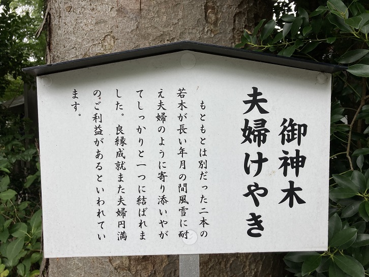 もともとは別だった二本の若木が長い年月の間風雪に耐え夫婦のように寄り添いやがてしっかりと一つに結ばれました。良縁成就また夫婦円満のご利益があるといわれています。