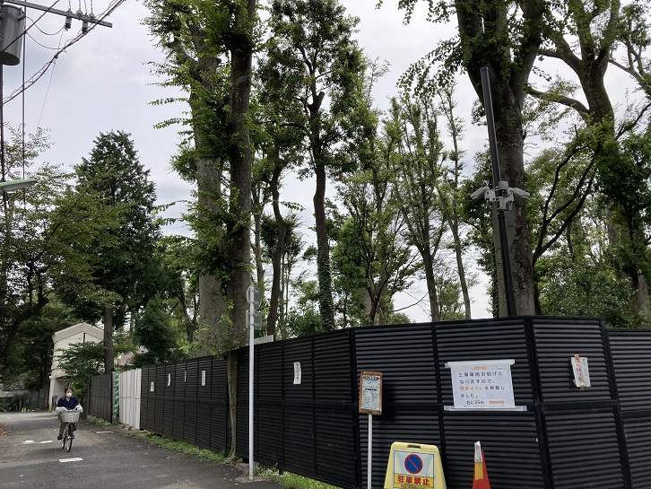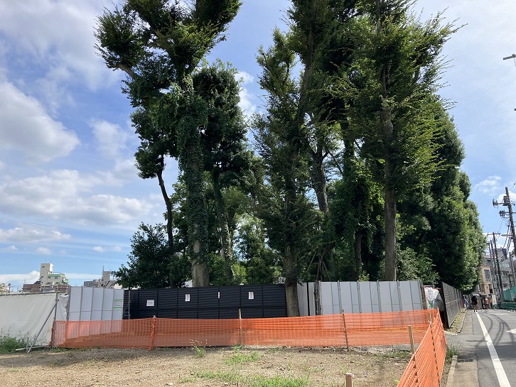 2022年9月12日時点のけやき屋敷の状況ですが、敷地は完全な更地にはなっておらず、杉並第一小学校に面した西側と屋敷塀が残る南側の私道沿いには未だ欅の大木が残されています。計画では、全ての立木を伐採するのではなく、西側と南側には木を残すようになっているのだそうです。今の景色がそのまま残ればいいのですが。