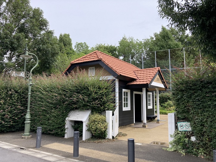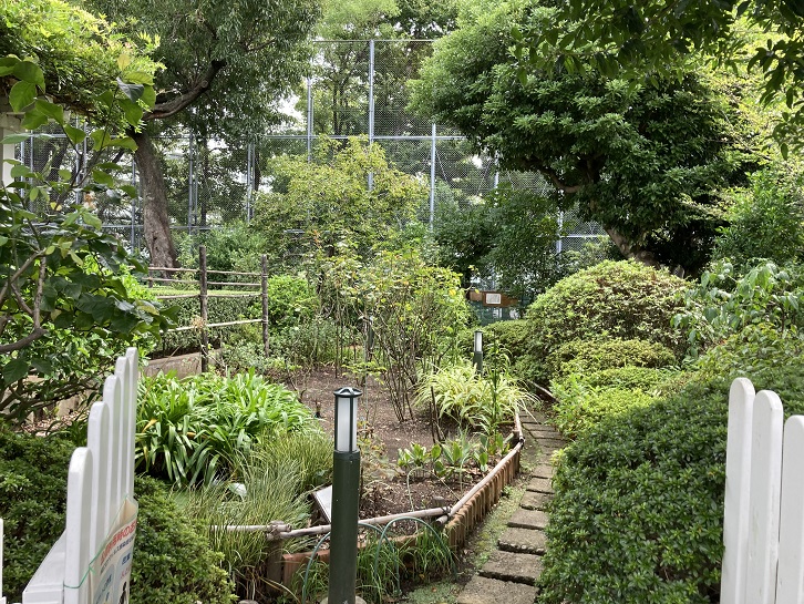 現在の建物はトイレと防災倉庫として使われていますので、当時の洋館よりは遙かに小さくなっています。その分、庭は広々としていますね。