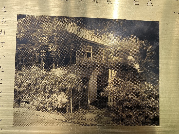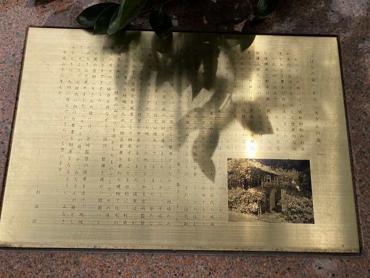 かって、ここには地域の人達から「ばらの家」と呼ばれた美しい洋館と庭園がありました。当時の邸宅の写真が添えられた杉並区による案内のプレートが石碑に貼られています。