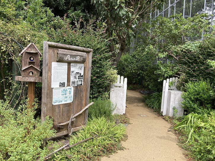 かってこの地には昭和初期の杉並の文化・生活を今に伝える歴史的な住宅とみどり豊かな庭がありました。大正十三年(1924年)、東京市震災復興局で都市計画に携わっていた近藤謙三郎氏の設計により住宅は建てられました。外観は赤い素焼きの屋根瓦の洋風住宅でしたが、内部には和室も残し、当時の住宅の移り変わりを知る上でも貴重なものでした。バラの垣根越しに見える庭一面に美しいバラが植えられていたことから、道行く人からは「ばらの家」と呼ばれていました。近藤氏の姪英氏が受け継いだ後も、アニメ「となりのトトロ」に登場するトトロが喜んで住みそうな家として、宮崎駿監督著「トトロの住む家」で紹介されるなど、地域のみなさんにも親しまれ、住宅取り壊しの危機には、六千三百余の住宅保存の署名が集まりました。区はこの地を買い上げ、公園として整備するために、地域のみなさんとともに公園計画の検討を進めました。しかし、平成二十一年二月、火災により住宅は焼失してしまいました。新たな公園計画を余儀なくされていた時、この地をよく知る宮崎監督から区へ公園デザインの提案の申出がありました。提案は、かっての住宅の雰囲気を風景として継承することを目的に、利用者のための便所と地域のための防災倉庫を兼ねた建物で住宅の雰囲気を再現し、既存のみどりを活かしたものでした。その後、多くの方々のご協力を得ながら、設計・整備を進め、開園へと至ることができました。公園の名称「Aさんの庭」は、宮崎監督の提案を受け、地域のみなさんで決めました。「Aさんの庭」が、みなさんの庭として、そして、次世代に向けた貴重な財産となるように、みなさんとともに、大切に育んでいきたいと思います。