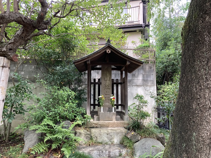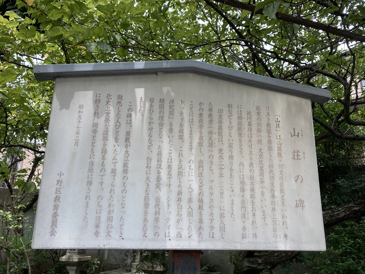 本堂の横に「山荘の碑」が建っています。「山荘」とは、徳川幕府によって厳しく取り締まられたキリスト教徒を拘置した切支丹屋敷のことです。
