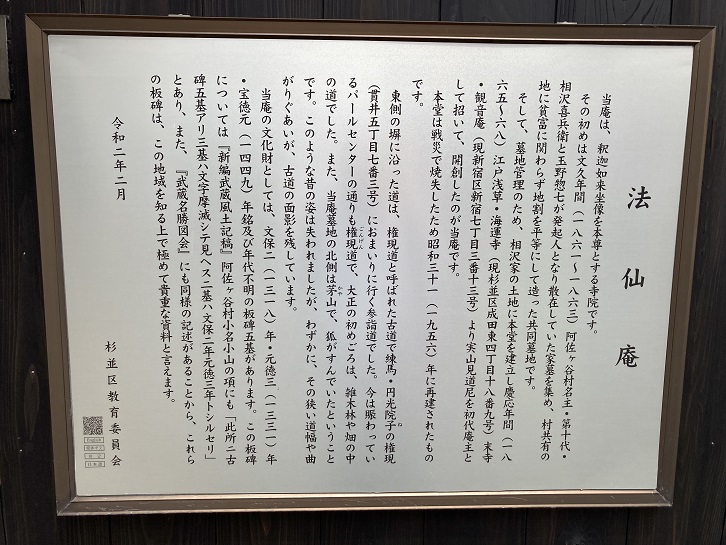 法仙庵は、「けやき屋敷」の当主だった相沢喜兵衛が旧阿佐ヶ谷村共有の土地に造成した共同墓地を管理するために、自らの所有地を提供して開創した庵が起源となっています。