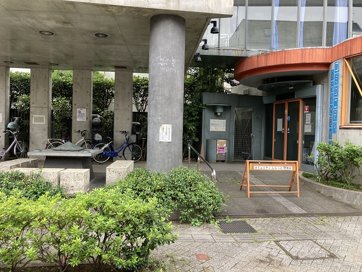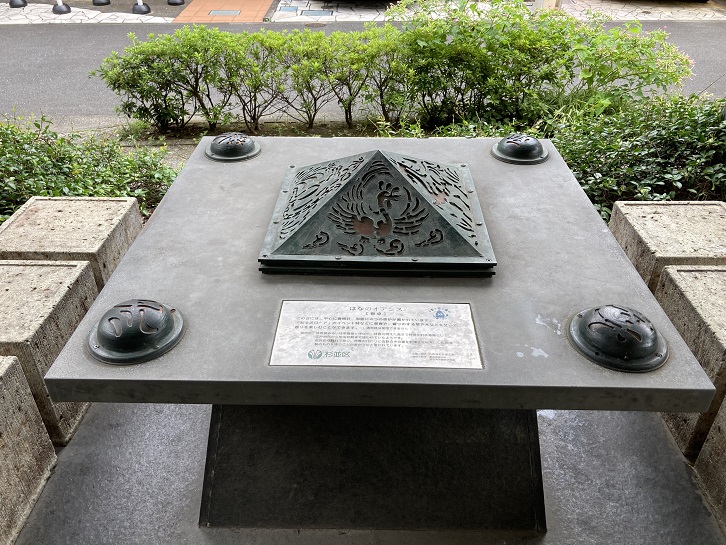 阿佐ヶ谷出張所のエントランスに、見所ポイント9の「はなのオアシス」があります。杉並区内には善福寺川緑地や神田川沿いの遊歩道、歴史をたどる史跡めぐりなど、さまざまな散歩コースがありますが、そのひとつに「知る区ロード」があります。昭和六十三年(1988年)にルートが設定され、全長約36km、東西輪が重なるようにしてつながる散策路になっていて、杉並区内の主な名所旧跡や大きな公園、区の施設などを巡ることができるようになっています。このルートには、人間の五感をテーマにした休憩所である「ときのオアシス」・「はだしのオアシス」・「みみのオアシス」・「はなのオアシス」が設置されています。「はなのオアシス」の「はな」は「鼻」の意味で、エントランスには嗅覚や鼻に効くツボ押し器具が設置されています(柱の間に見える奇妙な形の器具です)。テーブルの上には、これまた奇妙な形の四角錐の置物と灰皿をひっくり返したような形の置物が置かれています。