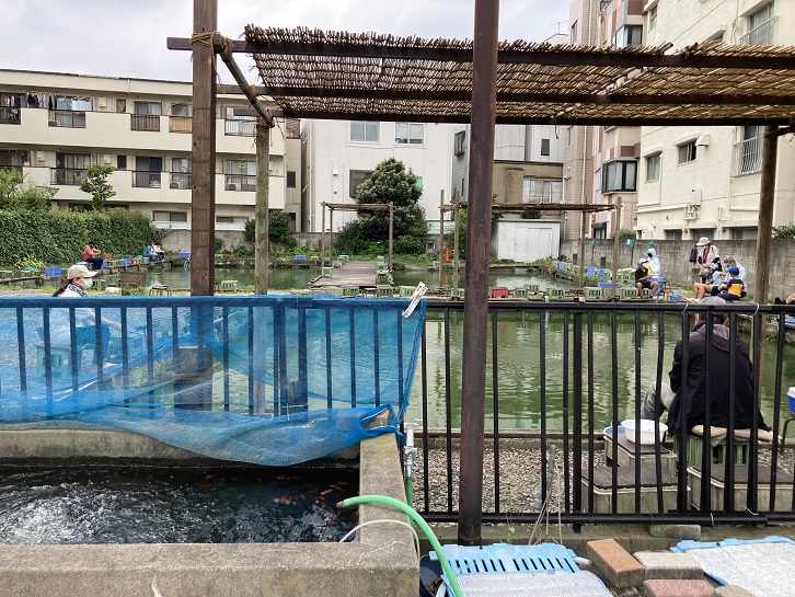 見所ポイント10の「つり掘(寿々木園:すずきえん)」は、阿佐ケ谷駅南口から徒歩3分に立地する大正十三年創業の老舗の釣り堀です。以前はもっと広く、釣り池の数も多かったようですが、現在は水槽の種類は2種類のみで、10m四方ほどの金魚の池と、その2倍の大きさのフナや鯉が釣れる池があります。人気は金魚の池だそうで、金魚すくいの定番である和金だけでなく、大きな蘭鋳(ランチュウ)や琉金(リュウキン)など、1万円越えの価値のある金魚も泳いでいるみたいです。