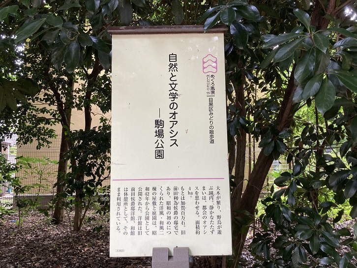 見所ポイント@の「駒場公園」は、加賀百万石(今の石川県)の当主だった旧前田家の前田利為侯爵駒場邸跡に造られました。前田侯爵がこの地に邸宅をかまえたのは昭和の始めの頃です。明治十一年に設立されて以来、近代農業に輝かしい業績を残した駒場農学校(後の東京帝国大学農学部)が本郷に移転した跡地を第一高等学校(現在の東京大学教養学部)、東京農業教育専門学校(旧東京教育大学農学部)とともに分割使用したものです。建物は昭和初期の和洋両建築の粋を集めたもので、化粧レンガやタイル張りの施された洋館は昭和四年、書院づくりの和館は昭和五年に完成しました。自然の巨木を活かし、名石をあしらった幽すいな奥庭や芝生の広場が設けられました。和館は侯爵がロンドン駐在武官であったことから、外人客接待用に建てたとも言われています。華々しい社交の場となったこの優雅な豪邸は、第二次大戦中に前田侯爵が戦死した後私人の手に渡り、終戦とともに占領軍に接収されました。昭和三十二年10月に接収が解除されるまでの12年間は連合軍司令官の官邸などとして使われました。現在の公園は、昭和四十二年に東京都が公園として開園したもので、昭和五十年4月に目黒区に移管されました。なお、和館は現在1階部分が一般に開放されていて、玄関から二の間、一の間(表座敷)と続く広間や、重厚な床の間・違い棚・付書院・欄間の透し彫などを備えた美しいつくりが昔のままに見ることができます。また、水屋・寄付・待合所を備えた茶室や和室も有料施設として利用されています。縁側からは、芝や流れのある池の配置が見事に調和した庭園が望め、落ち着いた雰囲気を味わえます。洋館も決められた時間帯に開館しています。和館北側には日本近代文学館が設置され、近代文学に関する資料が閲覧できます。