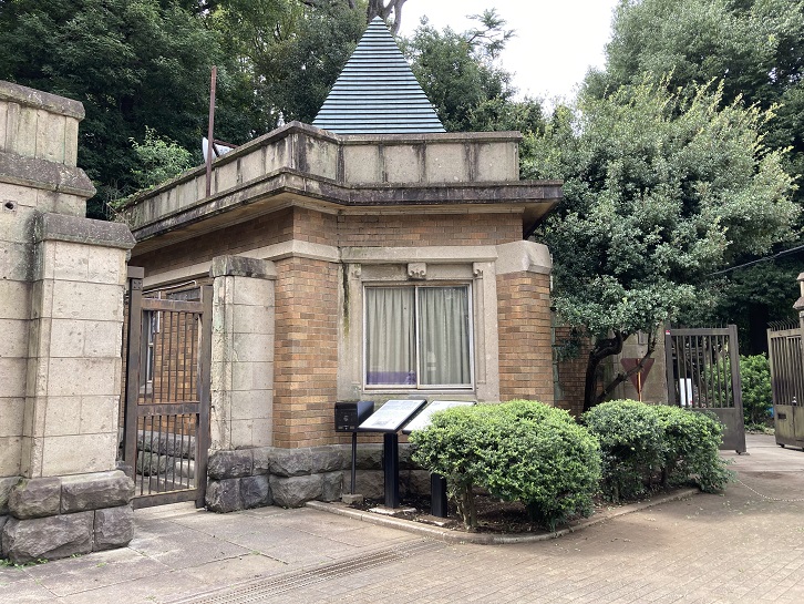 正門に付属する鉄筋コンクリート造平屋の門衛所で、小窓の柱頭飾りやピラミッド型の尖塔型屋根の意匠に特徴があります。外壁のスクラッチタイル貼など洋館と共通する仕上げや意匠が用いられており、洋館と同一設計者の設計によると思われます。前田侯爵が住んでいた時は、ここに門番がいて訪問者のチェックをしていました。往時の前田家の使用人は100人以上いたと伝えられます。内部は改装されていますが、外観は創建時の姿をよく留めています。