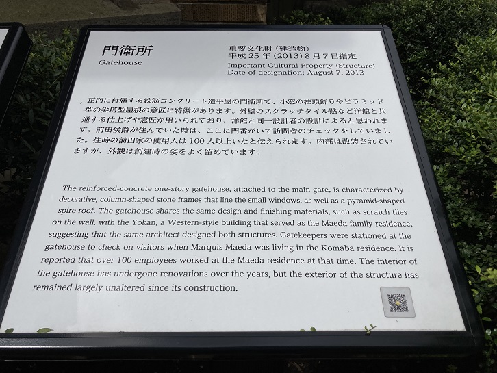 gatehouse to check on visitors when Marquis Maeda was living in the Komaba residence. It is reported that over 100 employees worked at the Maeda residence at that time. The interior of the gatehouse has undergone renovations over the years, but the exterior of the structure has remained largely unaltered since its construction.