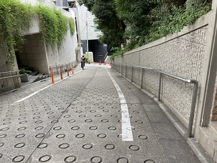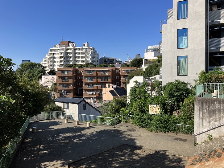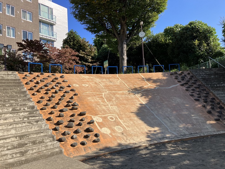 別所坂を下らず、坂上に建つマンションの横手に作られた私道を抜けて行きますと、見所ポイントGの「目黒新富士跡(別所坂児童遊園)」の入口に繋がっています。急峻な崖線を無理矢理削って造成されたような2段式の遊園には、段差を利用して斜面にボルダリングのような遊具も設けられています。