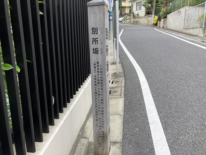 駒沢通りを横断し、恵比寿南三丁目交差点から高台の住宅地に入って行きますと、別所坂の上に出ます。雪の日には交通止めになりそうな急峻な坂ですが、坂の途中に名前の由来を記した案内板が立っています。