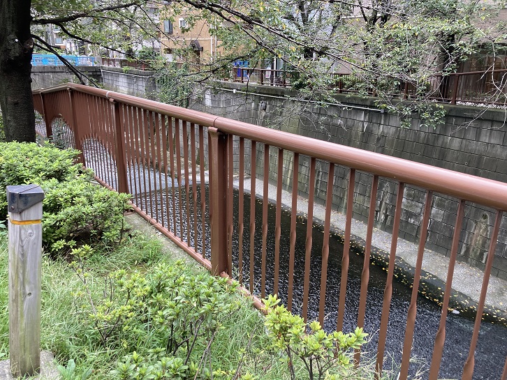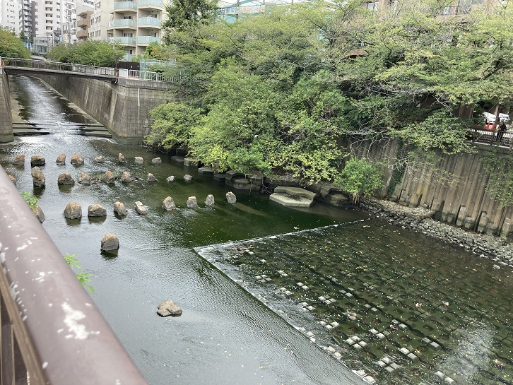 大橋ジャンクションの脇を目黒川が流れています。桜の名所としてお花見シーズンは激混みになりますが、今は夏の終わりで閑散としています。目黒川が清流に復活したのも行政の努力の賜です。