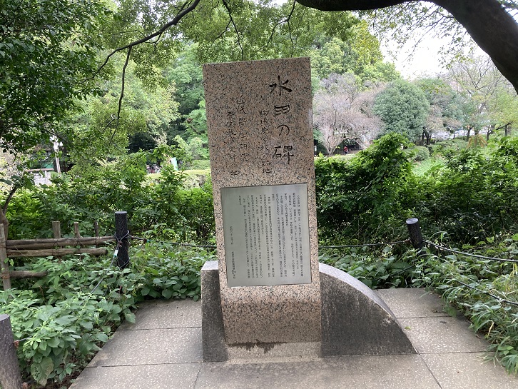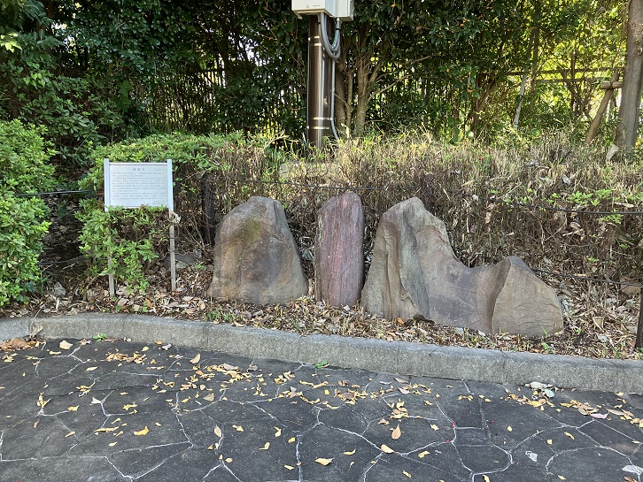 遊園の奥まった植栽の中に3基の石碑と案内板が置かれています。