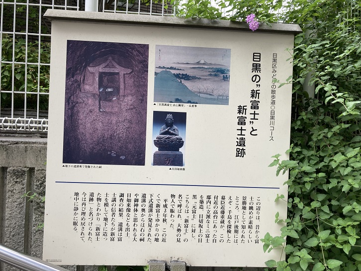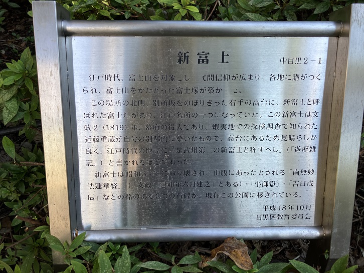 この辺りは、昔から富士の眺めが素晴らしい景勝地として知られたところ。江戸後期には、えぞ・千島を探検した幕臣近藤重蔵が、この付近の高台にあった自邸内に立派なミニ富士を築造。目切坂上の目黒”元富士”に対し、こちらは”新富士”の名で呼ばれ、大勢の見物人で賑わった。平成三年秋、この近くで新富士ゆかりの地下式遺溝が発見された。遺溝の奥からは石の祠や御神体と思われる大日如来像なども出土。調査の結果、遺溝は富士講の信者たちが新富士を模して地下に造った物とわかり「新富士遺跡」と名づけられた。今は再び埋め戻されて、地中に静かに眠る。