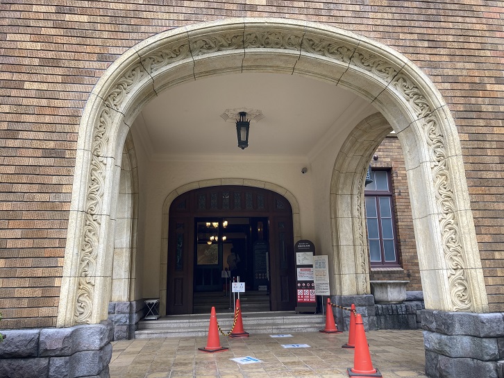 建物の外観を見てきましたが、私的には珍しく、内部も見学したいと思います。洋館の方が入りやすそうなので、アーチ型の車寄せから入館します。客人はここまで車に乗ったまま来ていたのでしょう。