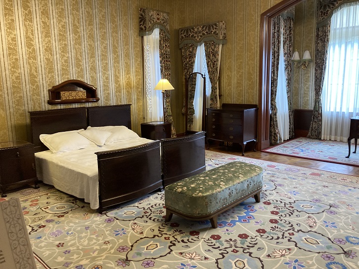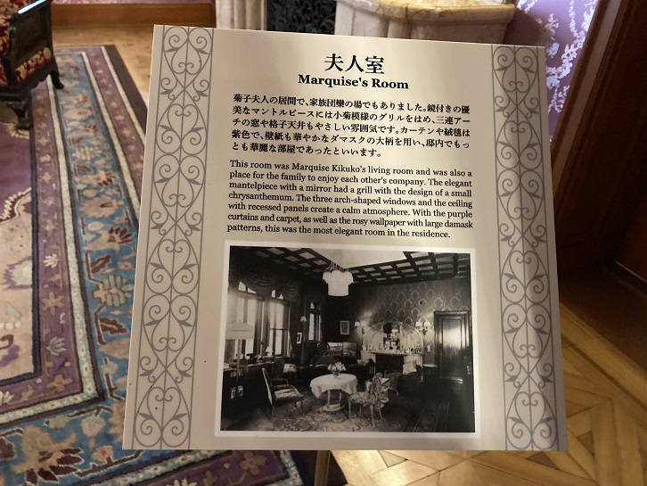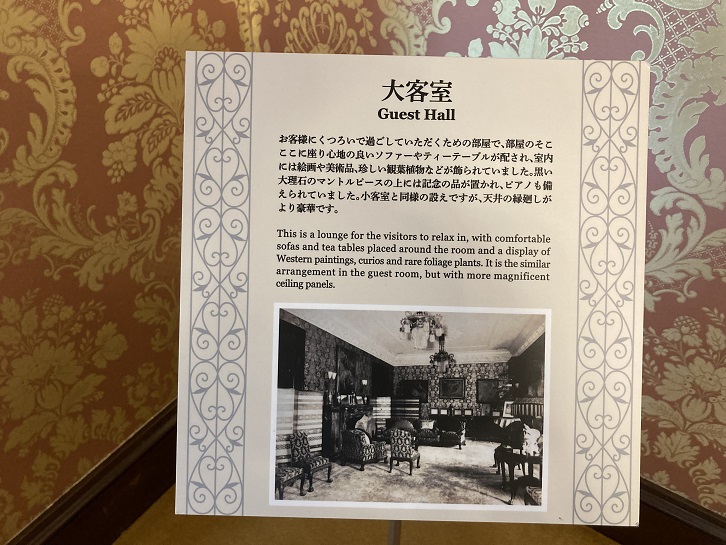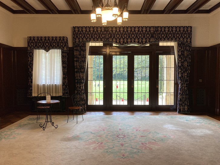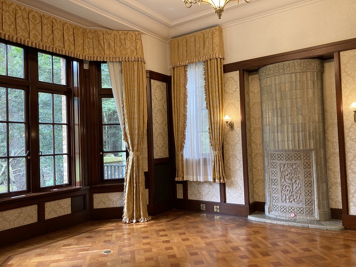 洋館内はとにかく広く、ベルサイユの宮殿のような豪華さです。部屋の数も幾つあるか見当もつきません。迷子になるかも。第一応接室は広い庭園に面していて、窓が大きく取られていますので、客人は緑の芝生を眺めながらの歓談を楽しんだことでしょう。