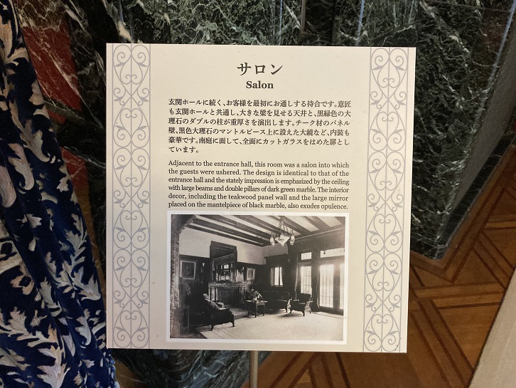 Adjacent to the entrance hall, this room was a salon into which the guests were ushered. The design is identical to that of the entrance hall and the stately impression is emphasized by the ceiling with large beams and double pillars of dark green marble. The interior decor, including the teakwood panel wall and the large mirror placed on the mantelpiece of black marble, also exudes opulence.