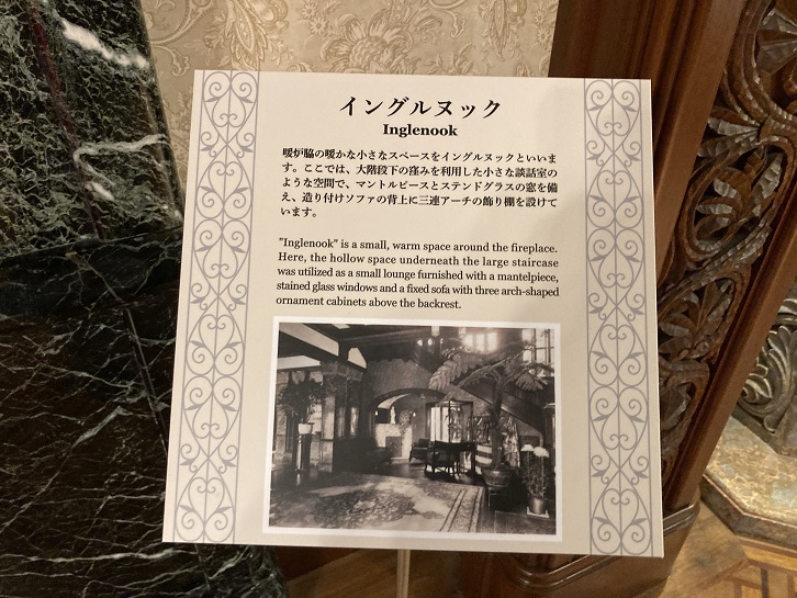暖炉脇の暖かな小さなスペースをイングルヌックといいます。ここでは、大階段下の窪みを利用した小さな談話室のような空間で、マントルピースとステンドグラスの窓を備え、造り付けソファの背上に三連アーチの飾り棚を設けています。