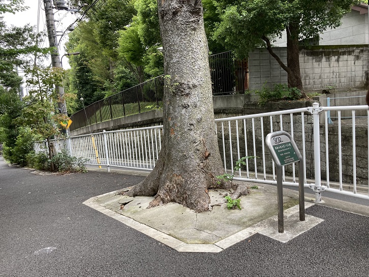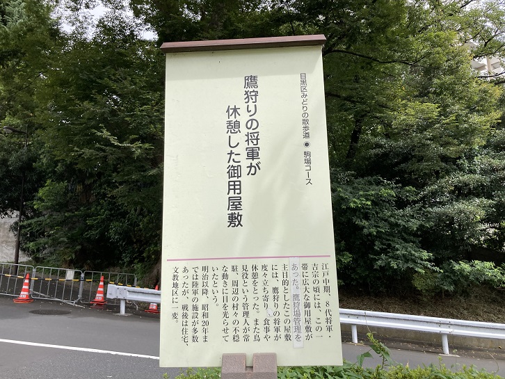 道路脇に案内板が立っています。目黒は落語の「目黒のさんま」の題材にもなったくらいですから、江戸時代は広大な原野だったのでしょう。「目黒のさんま」は三代目三遊亭金馬の得意とした小噺でした。低級な下魚として扱われていたさんまを庶民的な流儀で無造作に調理すると美味になりますが、丁寧に調理すると不味いという滑稽噺です。