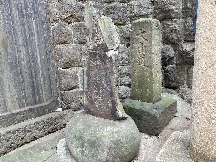 玉川通りから上目黒氷川神社の本殿に上る石段下に大山道道標が置かれています。現在の玉川通り(国道246号線)はかっての大山道の道筋に当たっています。