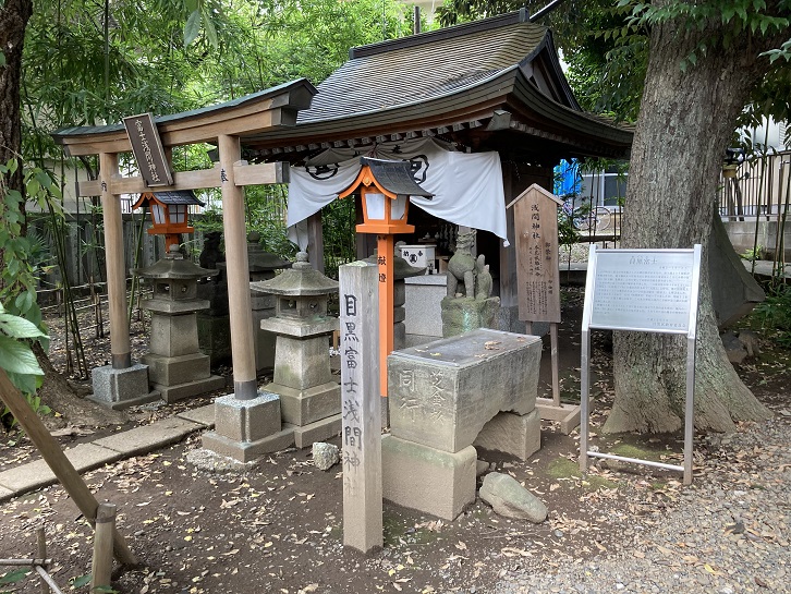 祭神は素盞嗚命(すさのおのみこと)を主神とし、天照大御神(あまてらすおおみかみ)、菅原道真を合祀しています。旧上目黒村の鎮守で、天正年間(1573年〜1592年)に上目黒村の旧家加藤氏がこの地に迎えたといわれています。正面の石段は文化十三年(1816年)に造られましたが、明治三十八年(1905年)に前を通る大山街道(現、玉川通り)を拡張する際に、現在の急勾配な石段に改修されました。境内には、花崗岩造りの4基の鳥居や小松石造りの2対の狛犬があります。また、石段の下には「武州荏原郡菅刈荘目黒郷」と刻まれた供養塔や、天保十三年(1842年)に建てられた大山道の道標があります。大山道は江戸時代、石尊参り(現、神奈川県伊勢原市の大山への参詣)をする多くの人々が利用しました。境内には、目切坂上(現、上目黒1−8付近)にあった目黒元富士から石碑などが移され、「目黒富士」と称す登山道が築かれています。
