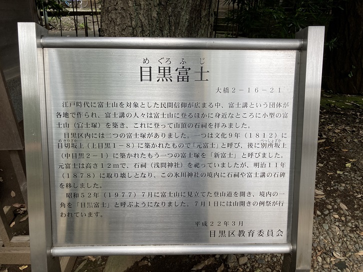 江戸時代に富士山を対象とした民間信仰が広まりました。人々は富士講なる集まりを作り、実際に富士山に登頂したほか、身近な所に富士山を模した「富士塚」を築いて祠を作りました。目黒区内には現在の上目黒一丁目付近に文化九年(1812年)に築かれた目黒富士があり、高さは12メートルありました。文政二年(1819年)には現在の中目黒二丁目付近にも新しく富士塚が築かれたことから、上目黒の富士塚を「元富士」と呼び、中目黒に造られた富士塚を「新富士」と呼びました。いずれの富士塚も歌川広重の「名所江戸百景」に描かれた名所でした。元富士は、明治十一年(1878年)に敷地が岩倉具視の別邸となった際に石祠や石碑類が上目黒氷川神社境内に移され、浅間神社も神社内に遷座しました。塚の場所はその後根津嘉一郎邸となり、昭和十四年(1939年)の邸の改築の際に破壊され、新富士も昭和三十四年(1959年)に取り壊され、現在はどちらも残されていません。その後、昭和五十二年(1977年)に富士山に見立てた登山道が造られ、神社内の一角が新たな「目黒富士」とされ、毎年7月には山開きの例祭が行われています。