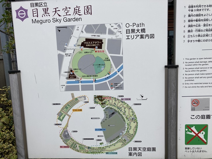 見所ポイントBの「目黒天空庭園」は、大橋ジャンクションの屋上を緑地化した庭園で、平成二十五年(2013年)3月30日に目黒区の区立公園としてオープンしました。ドーナツのような楕円形が特長で、高さは地上11メートルから35メートル、延長距離は約400メートルで、平均勾配が約6%のループ状になっています。最も低い部分はオーパスブリッジ経由で玉川通りに連絡しています。庭園には芝生を基礎として約30種類の樹木や花が植えられています。南側に設置されているエレベーターの3階が庭園となっていて、バリアフリー対策が施されているために車椅子やベビーカーでの入場も可能となっています。