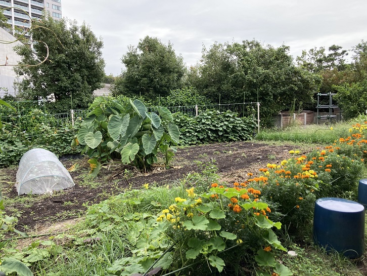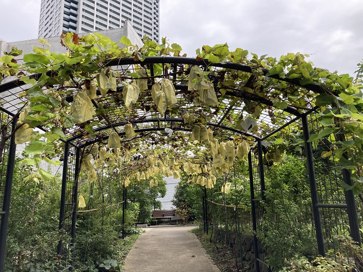 庭園には植栽だけでなく、野菜畑やブドウ棚のあります。ここで栽培されているブドウは赤ワイン品種であるマスカット・ベーリーAで、収穫されたブドウを使用して山梨県勝沼町のワイナリー実際にワインを作っています。収穫量が少ないために本数は少ないですが、瓶詰めされて収穫祭で供されます。私も頂いたことがあります(ここをご覧下さい)。【注意:戻る場合は「戻る」ボタンは押さず、「←」で復帰して下さい。】