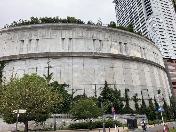 玉川通りの頭上を通る首都高3号渋谷線と首都高中央環状品川線を接続する大橋ジャンクションは、ローマ帝国のコロッセオのイメージが一部に取り入れられた巨大な円柱形をしています。どれだけのコンクリートが使われたのか想像もできません。