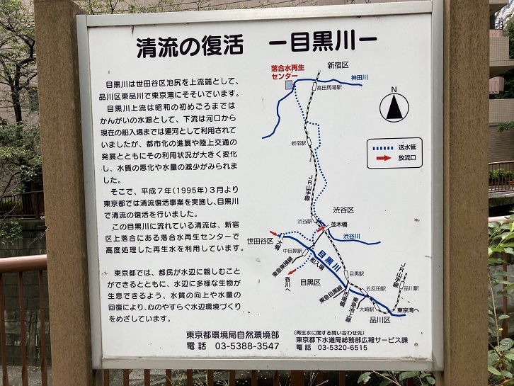 目黒川は世田谷区池尻を上流端として、品川区東品川で東京湾にそそいでいます。目黒川上流は昭和の初めごろまではかんがいの水源として、下流は河口から現在の船入場までは運河として利用されていましたが、都市化の進展や陸上交通の発展とともにその利用状況が大きく変化し、水質の悪化や水量の減少がみられました。そこで、平成七年(1995年)3月より東京都では清流復活事業を実施し、目黒川で清流の復活を行いました。この目黒川に流れている清流は、新宿区上落合にある落合水再生センターで高度処理した再生水を利用しています。東京都では、都民が水辺に親しむことができるとともに、水辺に多様な生物が生息できるよう、水質の向上や水量の回復により、心のやすらぐ水辺環境づくりをめざしています。