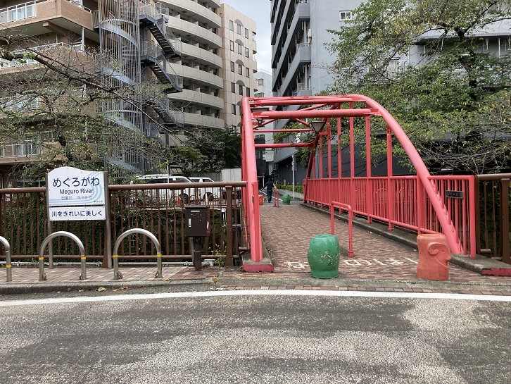 目黒川に朱色に塗られた人道橋が架かっています。近くに神社でもあるのかなと思いましたが、この辺りは住宅や商店しか見当たりません。ネットで調べてみたところ、戦前にこのあたりを占有していた地主が架けた私的な橋らしいとのことです。きっと風流な大人だったのでしょう。