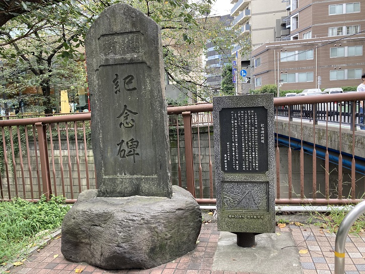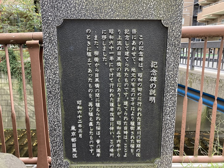 目黒川の河岸に記念碑と、桜を植樹した経緯を説明した石碑が建っています。
